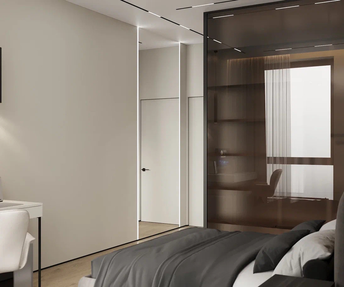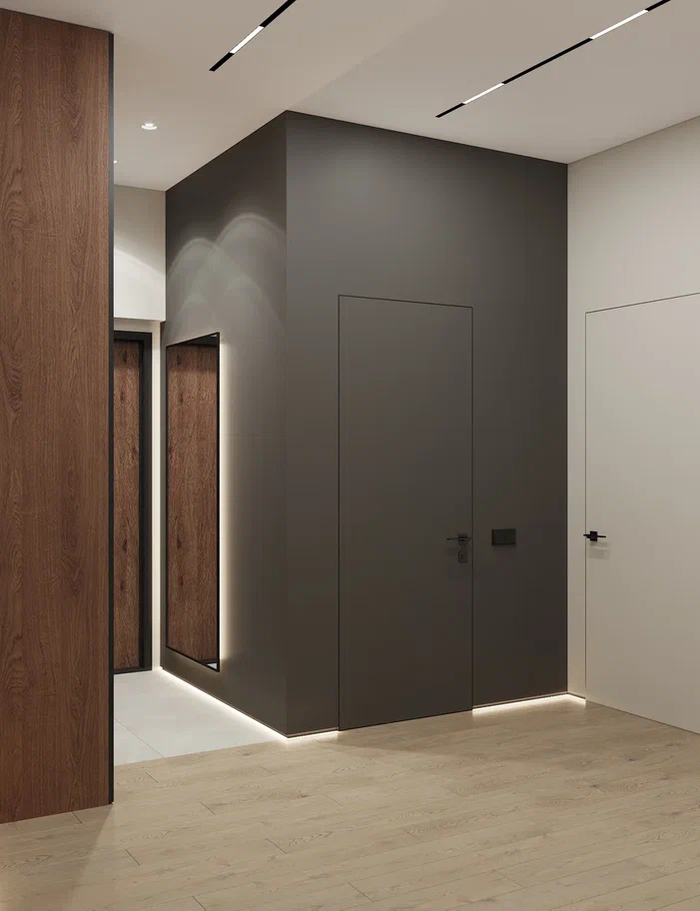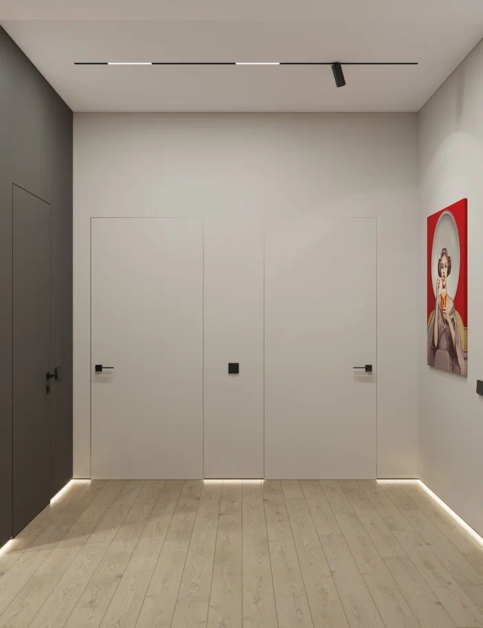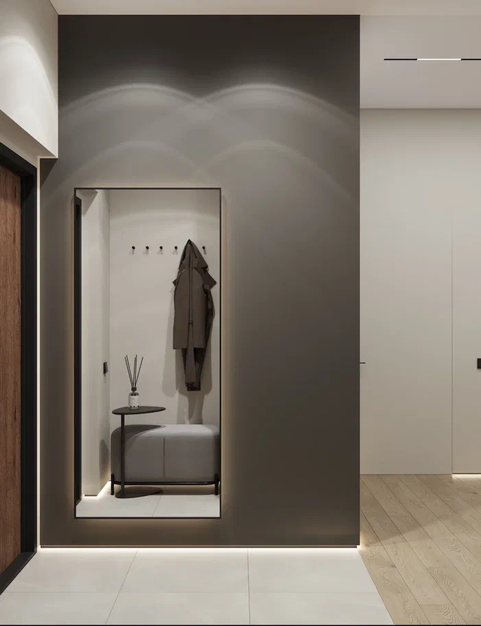 Зеркальная ниша визуально расширяет пространство, добавляя глубину. Потолочные треки создают мягкое освещение, а подсветка по контуру пола делает интерьер воздушным. Акцентом выступает картина с ярким цветовым пятном, оживляющая нейтральную палитру.