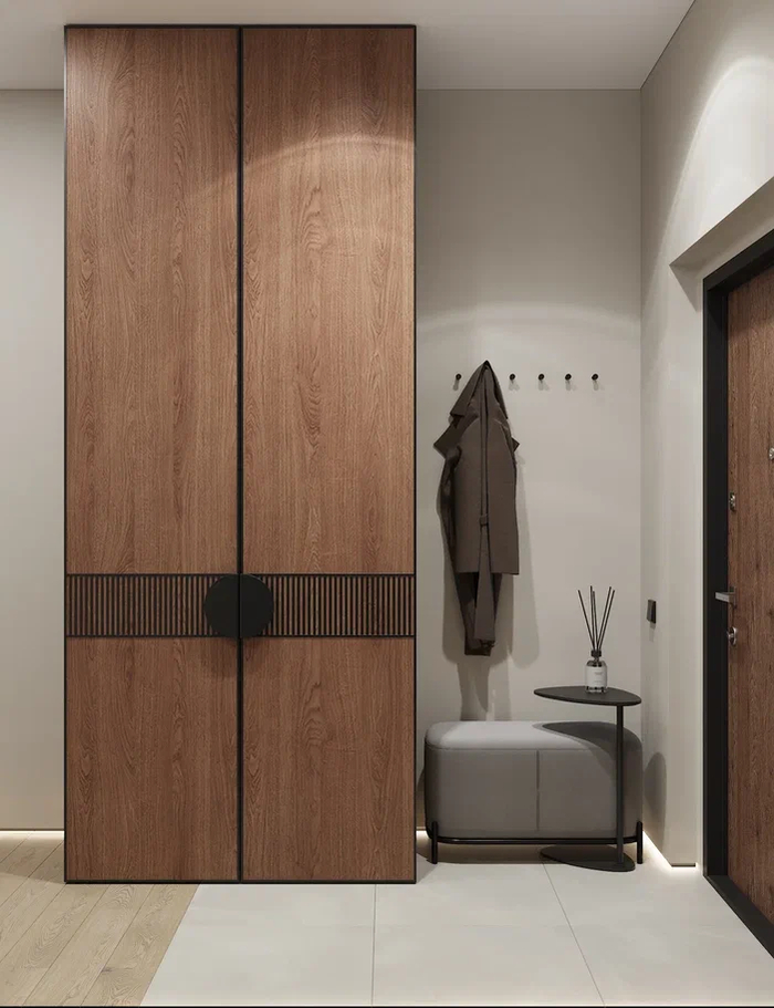 Прихожая оформлена в сочетании дерева, графита и светлых оттенков. Встроенный шкаф выполнен до потолка, со скрытой подсветкой и местом для техники, включая базу для робота-пылесоса. Рядом расположена мягкая банкетка и небольшой столик для мелочей.