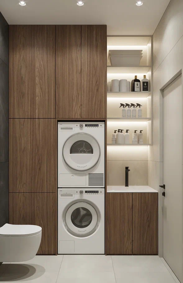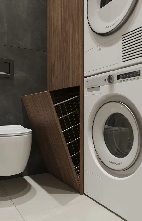 В постирочной установлены стиральная и сушильная машины, встроенные в шкаф под орех. Здесь же — мойка с чёрным смесителем и открытые полки с подсветкой для бытовой химии. В нижней секции предусмотрен выдвижной ящик для белья.