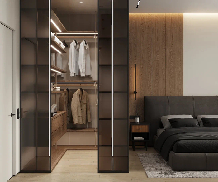 Гардеробную отделили стеклянными перегородками с подсветкой — она осталась частью пространства, не перегружая комнату. Внутри продумано хранение: полки, выдвижные ящики и вешала выполнены из натурального дерева.