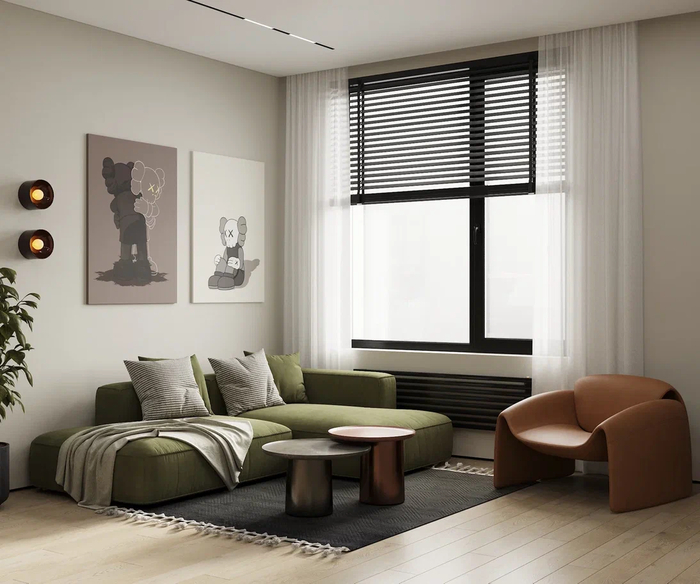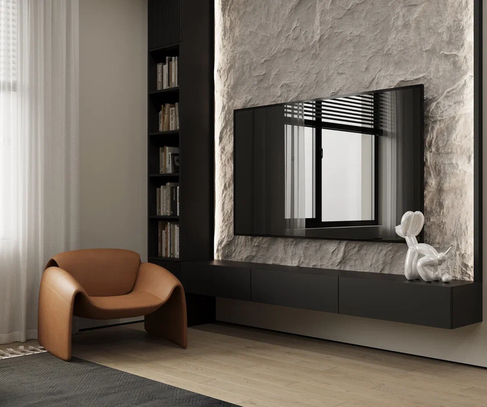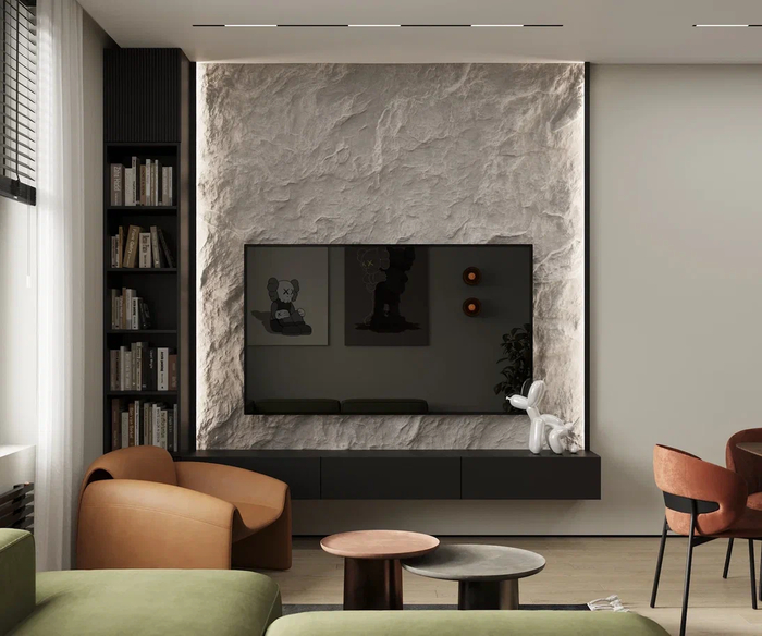 Главный акцент — стена с фактурой камня и встроенной подсветкой, задающая настроение зоне отдыха. Лаконичная консоль под телевизором добавляет лёгкости, а встроенные полки решают вопрос хранения. Зелёный диван стал цветовым центром композиции, а графичные постеры и мягкое кресло добавляют уюта.