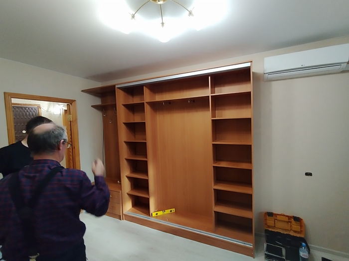 Я приехал очередной раз, мастера устанавливают шкаф купе. Я смотрю и учусь. Обратите внимание у шкафа слева полки и вешалка быстрого доступа. Очень продуманно, а то у всех стулья работают вешалками.