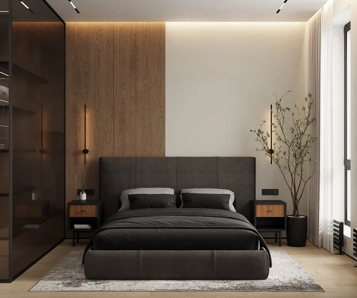 Спальня выдержана в спокойной цветовой гамме, где дерево сочетается с контрастной тёмной обивкой кровати. За изголовьем — панели с подсветкой, добавляющие глубину и мягкость освещения. У окна предусмотрено рабочее место с минималистичным столом и удобным креслом.