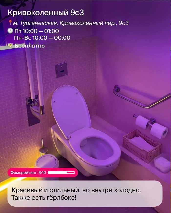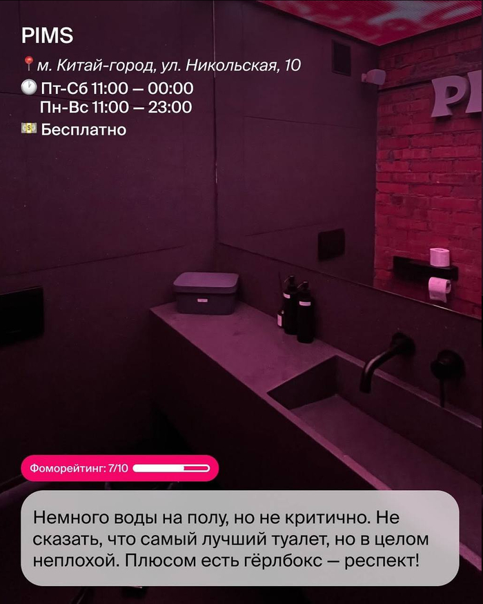 Унитаз-патруль провел анализ и отобрал 9 лучших мест в столице, где можно мало-мальски удобно отдохнуть во время лонгрида. Специалисты проанализировали стоимость, время работы и комфортабельность, а затем выставили оценку по десятибалльной системе. Но не заходите в женский там как обычно все загажено и в прокладках на стене.