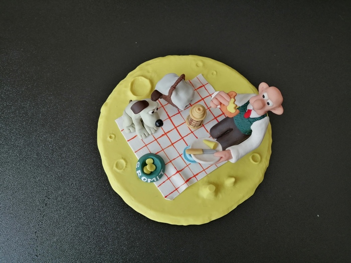 Лепила эту композицию 2 дня. Диаметр подставки 16 см, высота Уоллеса 9 см, а Громита 6 см. Это сценка из короткометражного мультфильма "Уоллес и Громит: Пикник на Луне".