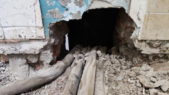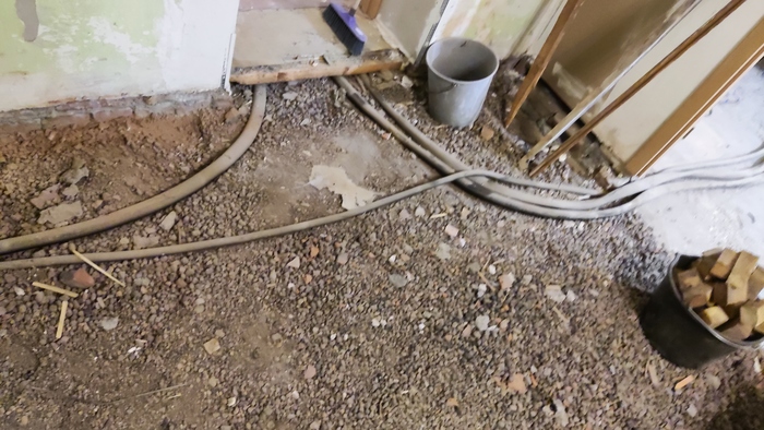 Параллельно был доразобран пол и окончательно ясен маршрут этих кабелей. Напомню что у нас есть четыре кабеля, по числу подъездов, которые идут из ВРУ и расходятся в разные стороны. Один из них заныривал в плиту перекрытия и уходил в неизвестном направлении.