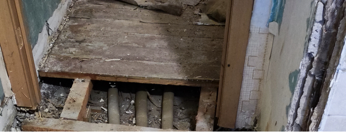 Начал делать ремонт в квартире, на первом этаже. Полы первого этажа хрущевок типа 1-447С-38 обычно устроены как черновая доска, лежащая на лагах, а всё это добро лежит на утеплителе из керамзита. Так-же было и тут, если бы не одно но. При вскрытии пола, там меня ждал не только керамзит:
