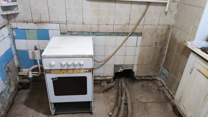 Прямо под газовой плитой. Учитывая что я не имею права отключать плиту, при разборке пола, прямо по этим кабелям пришлось вальсировать с газовой плитой в руках.