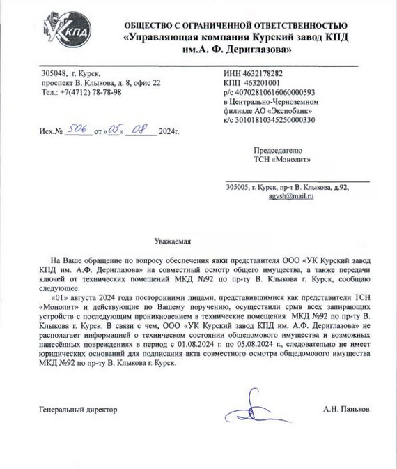 УК КПД Дериглазова сделала это «плавание» незабываемым. Первый день официально в ТСН, но ключи, документы и вообще всё ещё у КПД. На передачу по закону у них 3 дня. И происходит следующее:
