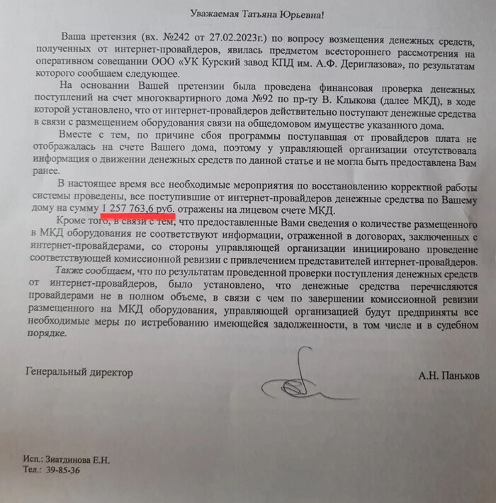 Началось с того, что мы не досчитались более миллиона рублей на счёте дома, которые должны были поступать от интернет-провайдеров. Договора есть, а деньги не поступают. Директор УК КПД Паньков на запрос о деньгах ответил, что провайдеры размещаются на безвозмездной основе. Однако, после досудебной претензии деньги чудесным образом нашлись.