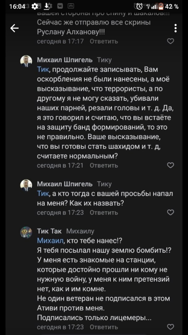 Адвокат Семёнова А.А. (постродавший уралец от Болгарского Чеченца) в ходе расследования уголовного дела, применял в адрес моей семьи угрозы жизни и здоровью. Ложно обвинил меня, что от моего имени, мои родственники Чеченцы напали на него со спины и истыкали всю спину миши шпигиля отвёрткой.