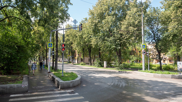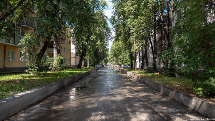 Здесь архитекторы помимо разных социальных и культурных учреждений ещё заложили обильное озеленение — всё же вред от производства был тогда очевиден, плюс популярная в то время концепция города-сада не давала покоя специалистам. На фото улица Ильича, которая застраивалась одной из первых: