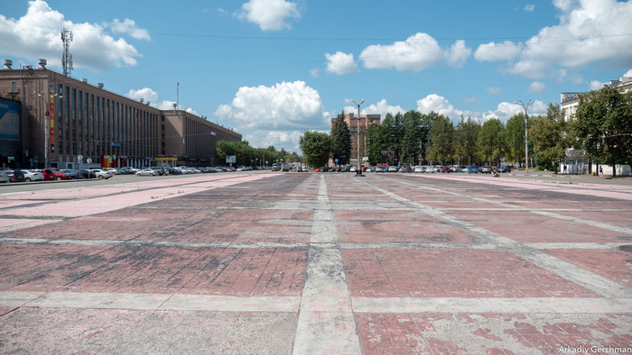 Сейчас здесь асфальто-бетонный плац с подобием транспортного хаба и остатками работы Покраса-Лампаса: