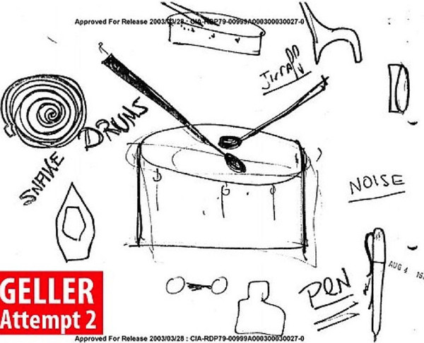 Для начала ученые произвольно выбрали слово из словаря. Выбор пал на слово «петарда», которую и нарисовали. Геллер, сидевший в другой комнате, телепатически принял эту информацию. И сообщил, что «видит» нечто цилиндрическое производящее шум. Но нарисовал, в итоге, не петарду, а барабан.