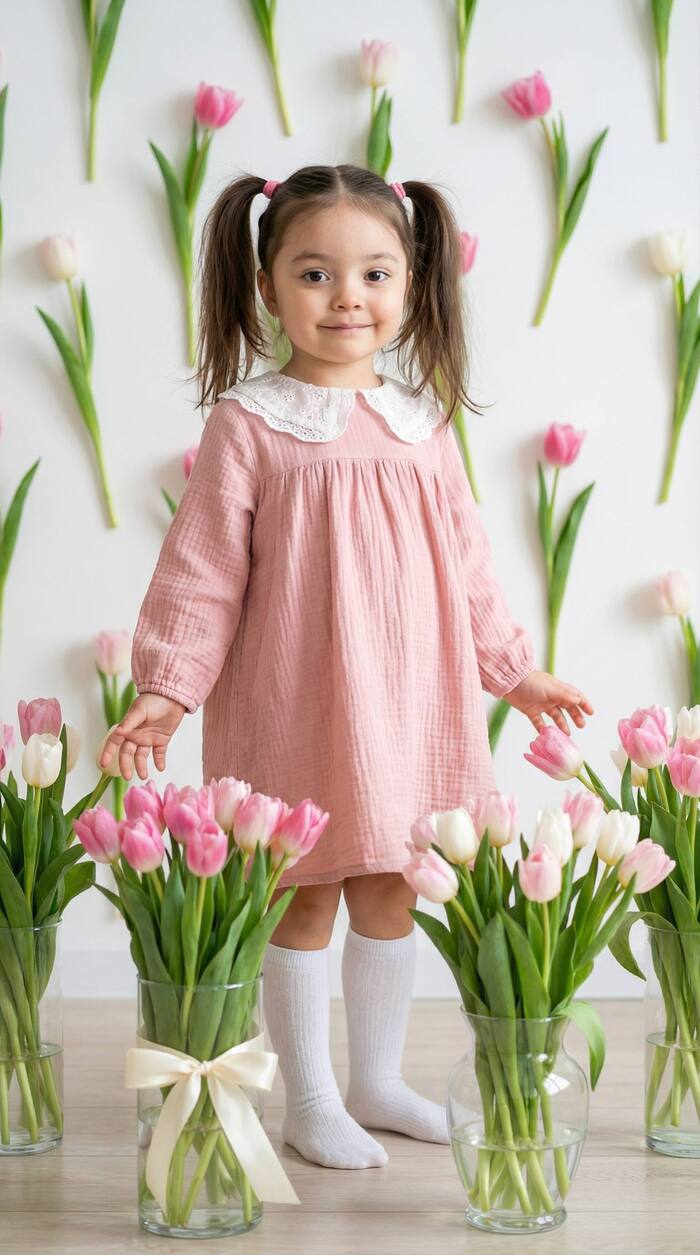 Высококачественный крупный портрет ребенка с фото, 100% сходство, в формате 9:16. В светлой нежной сцене девочка стоит в центре, немного повернувшись к камере. Волосы собраны в два хвостика на розовых резинках. Девочка в свободном платье мягкого розового цвета с белым кружевным воротником, чуть выше колен. На ногах высокие белые гольфы, без обуви, создавая домашнюю атмосферу. Фон пастельный: белая стена с зелёными стеблями и розово-белыми тюльпанами, на переднем плане три вазы с бело-розовыми тюльпанами, одна с кремовым бантом, остальные прозрачные, отражающие мягкий свет. Освещение мягкое, без резких теней, подчёркивает текстуру платья и нежность кожи. Поза расслабленная, руки слегка в стороны, будто готова прикоснуться к цветам. Атмосфера гармоничная, спокойная, передающая невинность и лёгкость весны; фотореалистично, высокая детализация, 8K.Natural skin texture with pores, peach fuzz. Эффект яркой жёсткой вспышки.