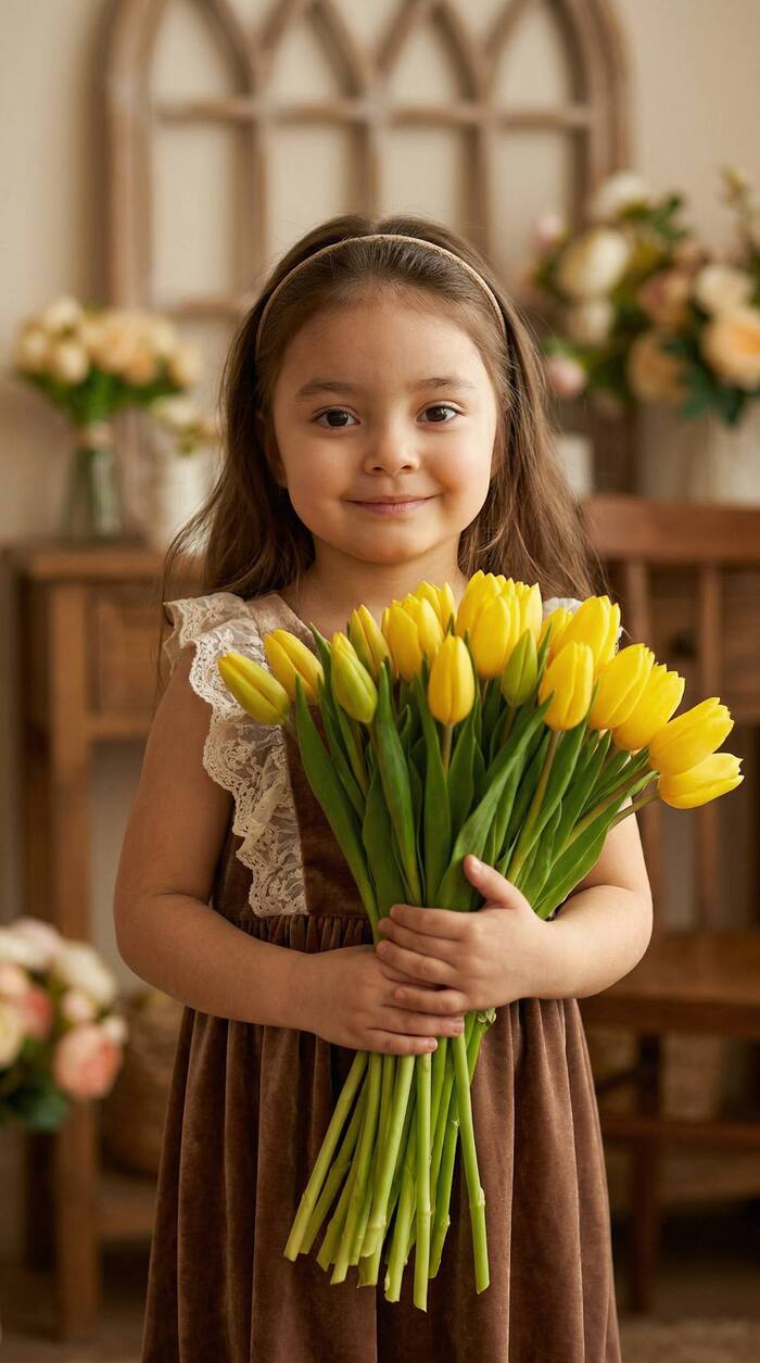 A young girl stands in an interior, holding a dense bouquet of yellow tulips with long green stems and closed buds. Her body is turned three-quarters to the camera, her shoulders slightly turned, her head held straight, her hands clasping the stems at chest level. Her pose is stable and static. The shot is from the waist up, at eye level. The composition is centered, with the figure slightly shifted to the left. The bouquet occupies the foreground and partially overlaps the line of her dress, while the background softly fades into out of focus.