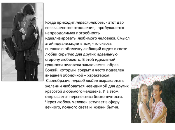 "Первая любовь - это рождение взрослой души, незримо раскрывающейся в божественном импульсе востороженной влюбленности"