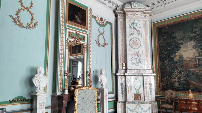 Небольшой уютный павильон «Эрмитаж» построили специально для проживания Петра Шереметева. Здание всегда оставалось местом для избранных гостей, с кем хозяин хотел поговорить без лишних ушей. Внутри — стены, украшенные резьбой, и зеркала, зрительно увеличивающие пространство. Бюсты римских цезарей в нишах добавляют величественность и помпезность, а вертикальные панели придают интерьеру изящество и изысканность.