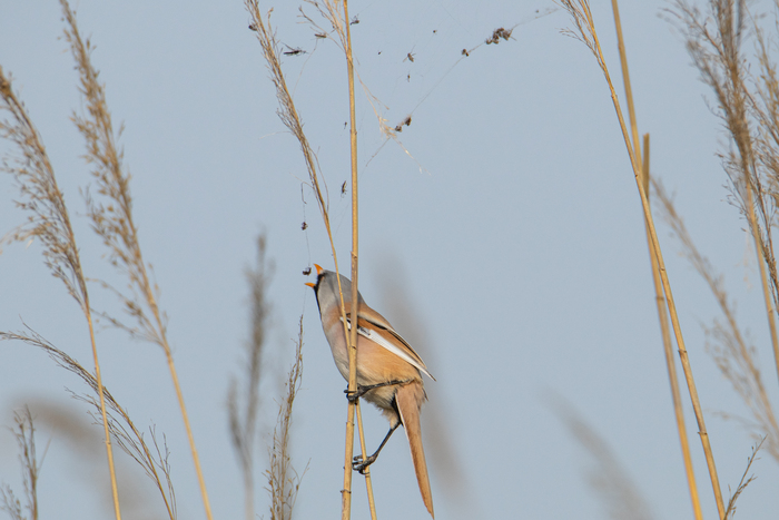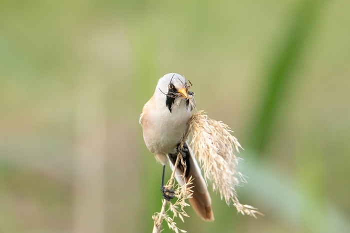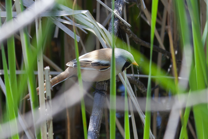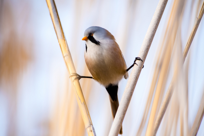 Как вы уже поняли, усатую синицу назвали так из-за черных полосок под глазами у самцов. Вот до чего доводит мода на барбершопы. У девушек-синиц таких полосок нет, да и оперение у дам более тусклое.