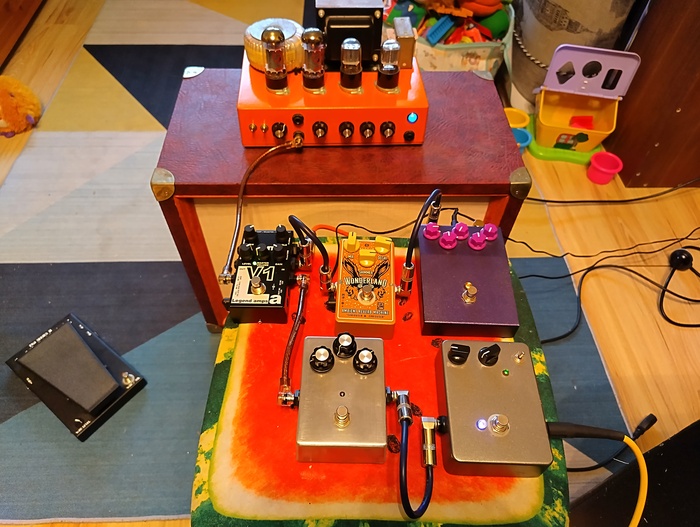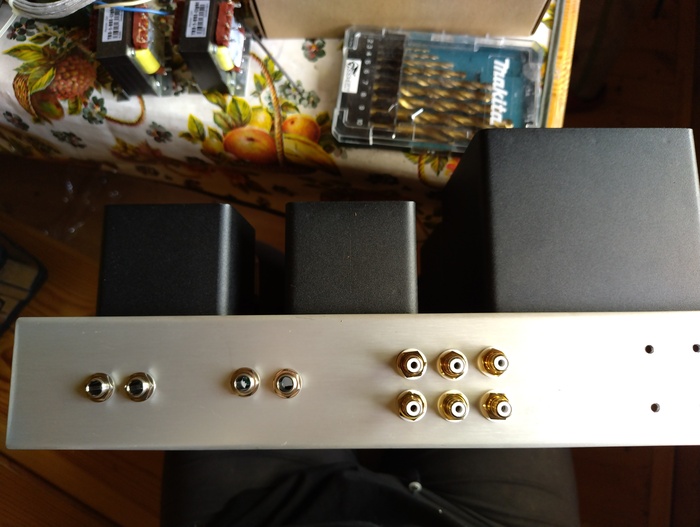 Привез самодельный однотакт с дачи домой и решил впасть в аудиофилию еще глубже: прицепил к нему виниловый выигрыватель. Выигрыватель включен через фонокорректор Рода Эллиотта, который спрятан в нижней алюминиевой коробке справа, светится голубым. Эта коробка - коммутатор каналов от моего самодельного усилителя класса Д, в ней помимо фонокорректора есть BT, входы переключаются с помощью реле.