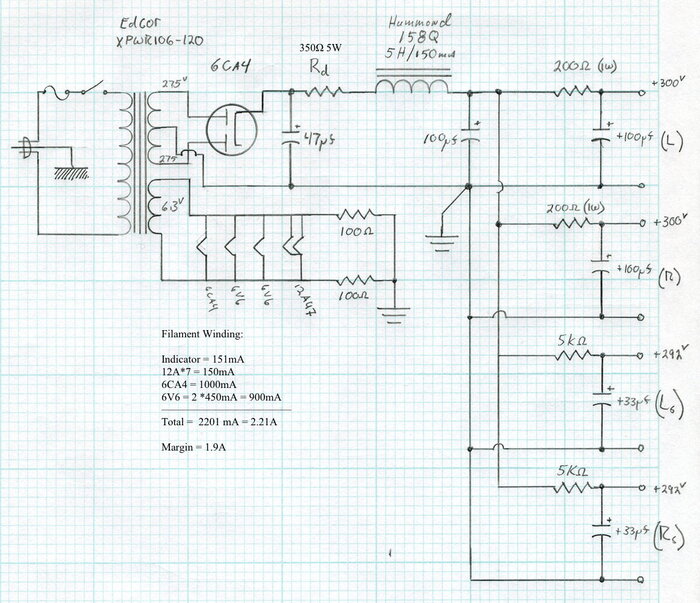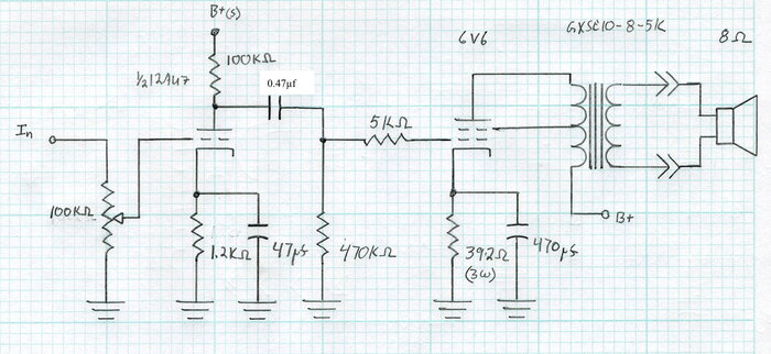 Тут у нас схема на 12AU7 и паре 6V6. 12AU7 у меня есть в виде какой-то ECC8...что-то там, но так не интересно, поэтому я буду использовать 6С2С, октальный одиночный триод с аналогичными характеристиками (это скорее аналог половинки 6н8с, но суть одна и та же), по триоду на каждый канал.