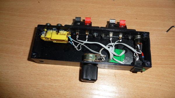Желтый разъем (RCA) и светодиод изначально приклеил тем же дихлорэтаном, но позднее укрепил ABS пластиком, растворенном в ацетоне. Хотя можно было приклеить суперклеем и содой, но у меня их не было.. Ну и ладно и так всё держится отлично. Паяем всё это. Рядом с модулем поставил конденсатор на 220u (лишним не будет) и резисторы по входу, для снижения сигнала - что бы не доходить до искажений.