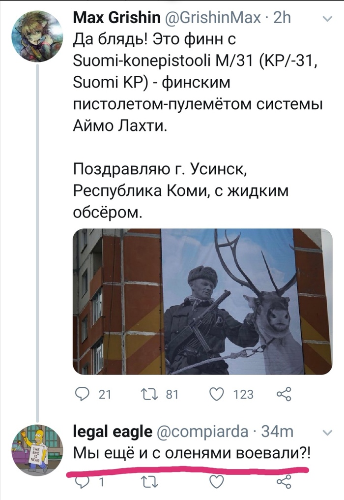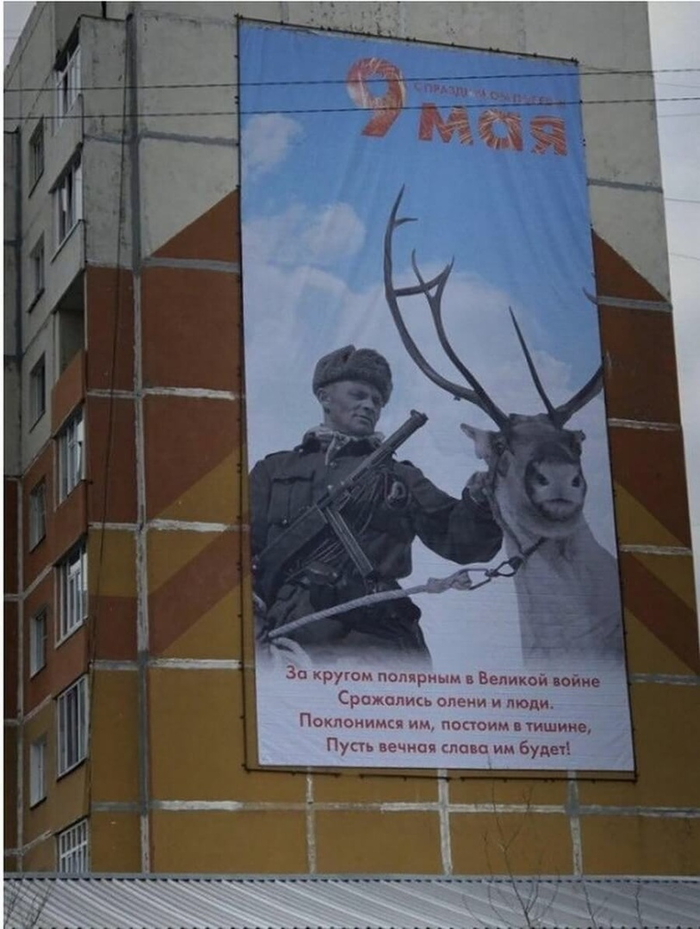 На самом деле на плакате финский солдат Юни Клемет Халонен из Утсйоки, Лапландия (родился в 1910 году), наслаждается солнечным светом со своим северным оленем (Rangifer Tarandus) в Лапландии, май 1944 года