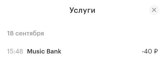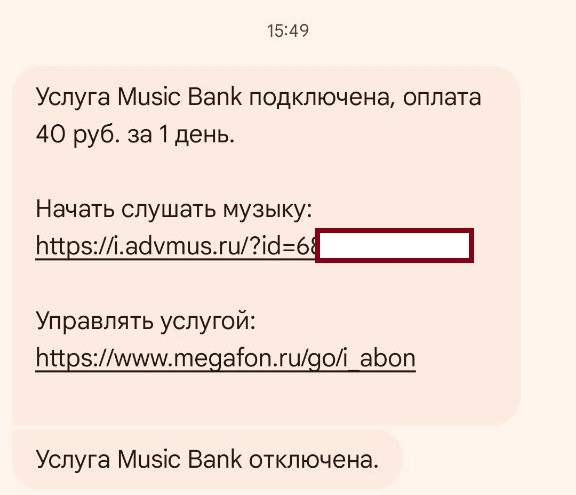 Итак, захожу на случайный сайт (всю историю сохранил), и прилетает смс о подключении услуги MUSIC BANK, а в приложении я вижу списание 40 руб.