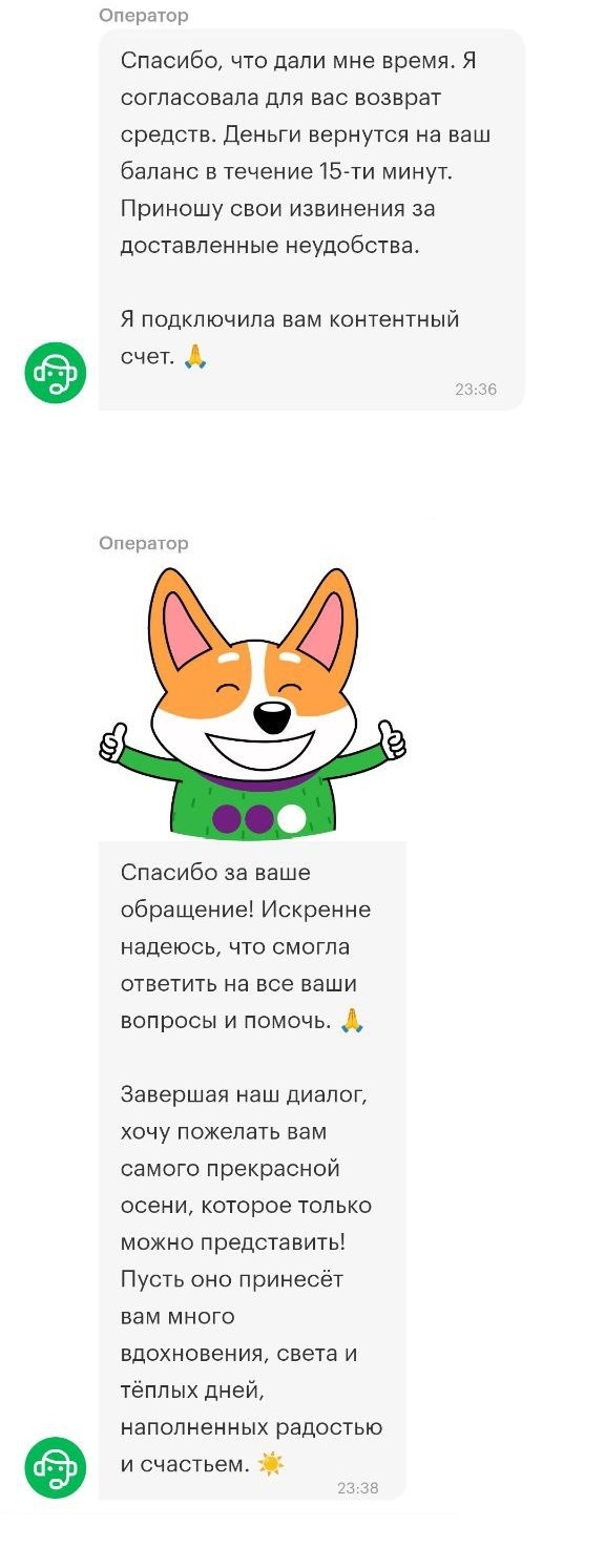 Ситуацию решил так: спасибо комментаторам, в приложении боту елене написал: подключи мне отдельный контент счет. Она сразу написала, что нашла мне оператора. Пока оператор здоровается успеваем написать ему чтобы вернули незаконно списанные деньги. Через 5 мин все сделано, а опер копипастит вам жополизательные пожелания: