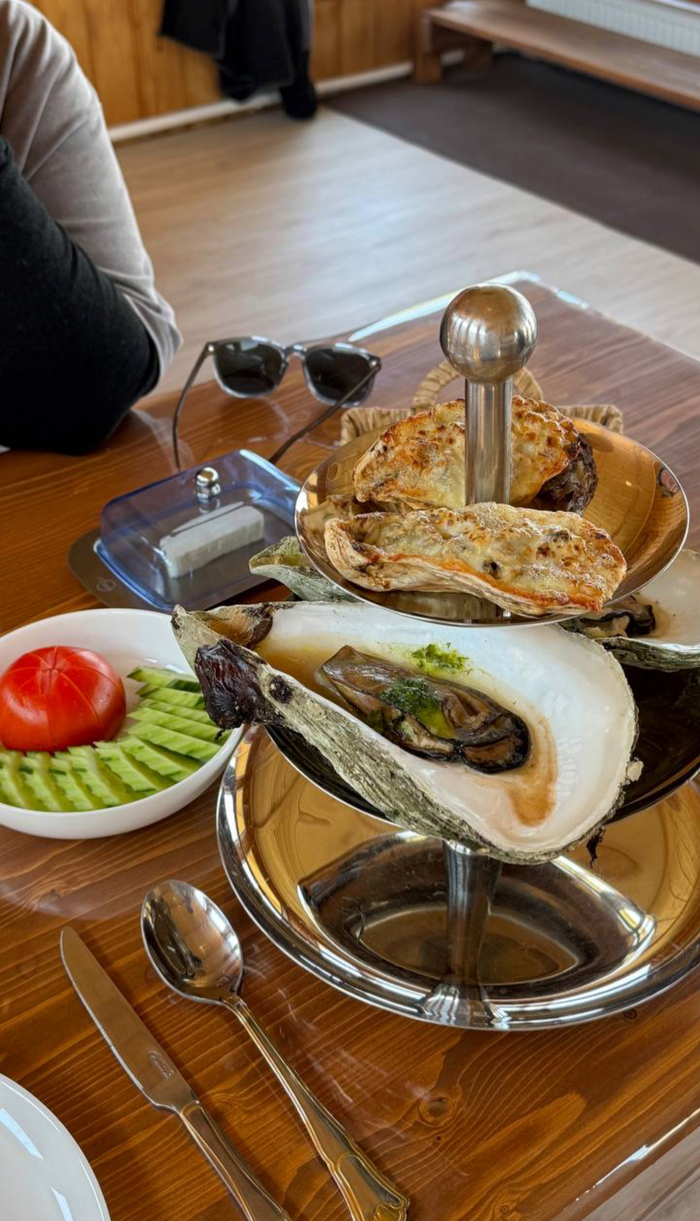 Устрицы сырые, запеченные, жульен из устрицы, гребешок, икра, уха и рыба запеченная и все это под бутылочку игристого. Ну меееееееед ❤️