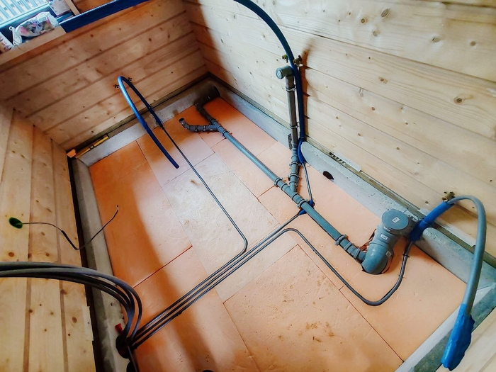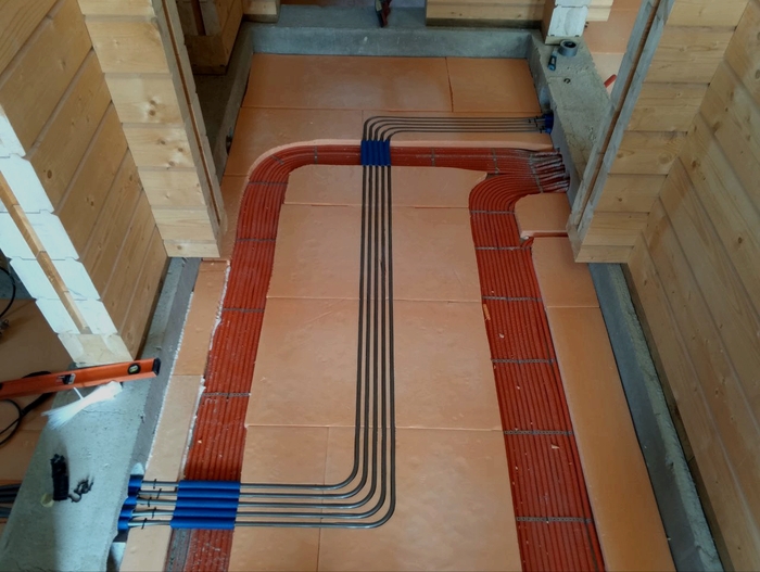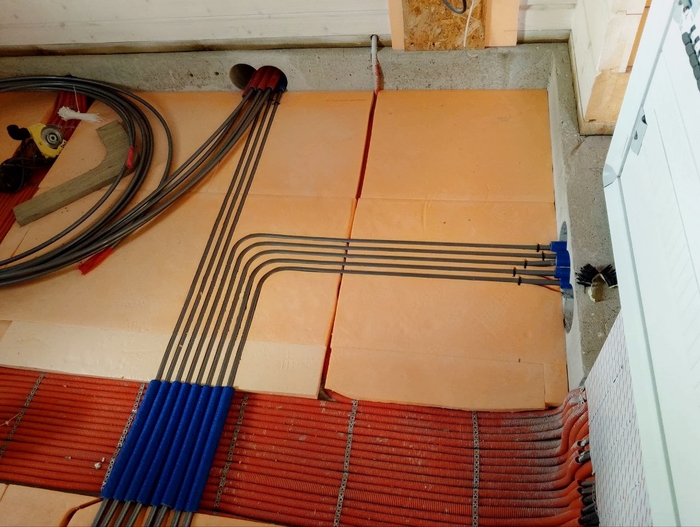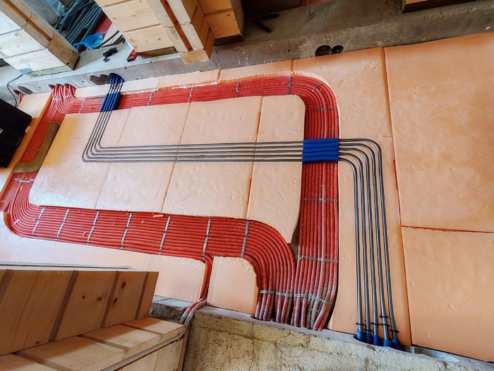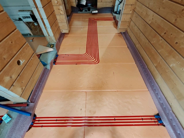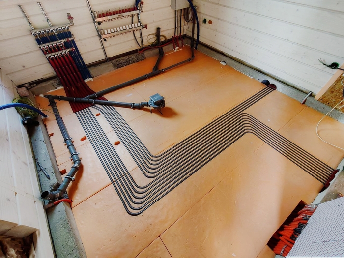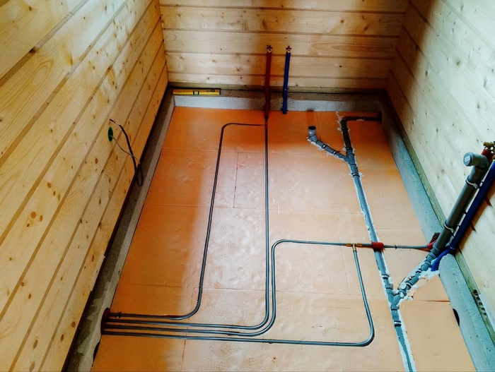 Монтаж трубопроводов в первом слое пеноплекса. Далее они закрываются вторым слоем, оказываясь ровно посередине двух слоёв утеплителя. По второму наматываются контуры теплого пола и заливается стяжка. Таким образом у транзитов нет теплопотерь в плиту, холодная вода не нагревается от стяжки, а горячая сама не перегревает отопительную плиту.