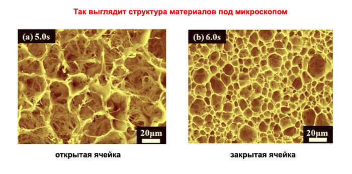 В закрытоячеистом ППУ в зависимости от класса и плотности изделия закрытыми являются ОТ 70 до 95% ячеек, а оставшиеся % могут быть открытыми. Это значительно снижает скорость проникновения влаги и воздуха в структуру материала, что замедляет процесс старения и уменьшает деградацию материала. Закрытоячеистая структура значительно снижает возможность распространения воды и пара, что способствует более долгосрочной сохранности теплоизоляционных свойств и увеличивает срок службы материала.
