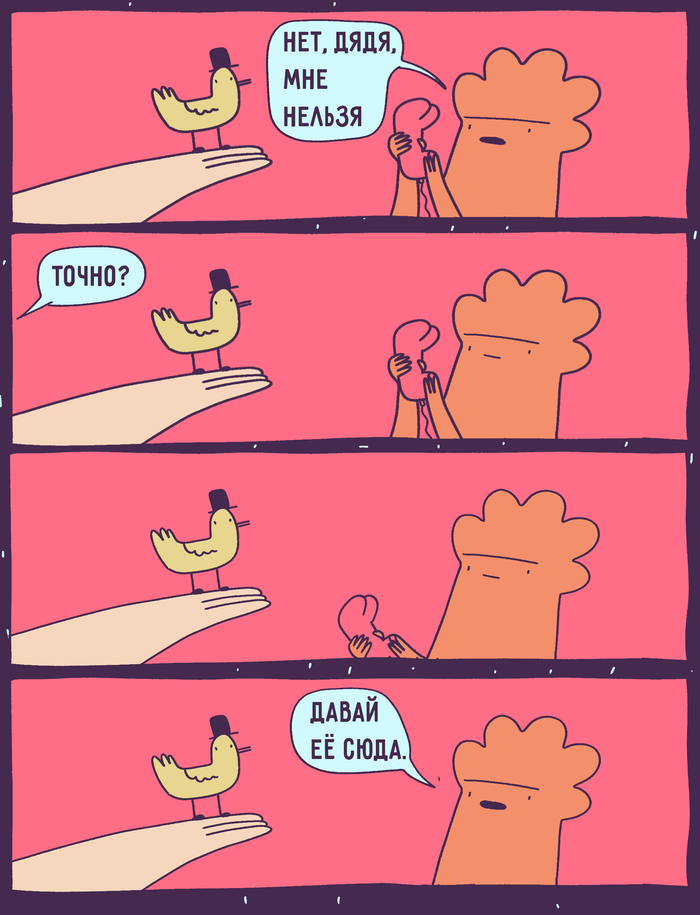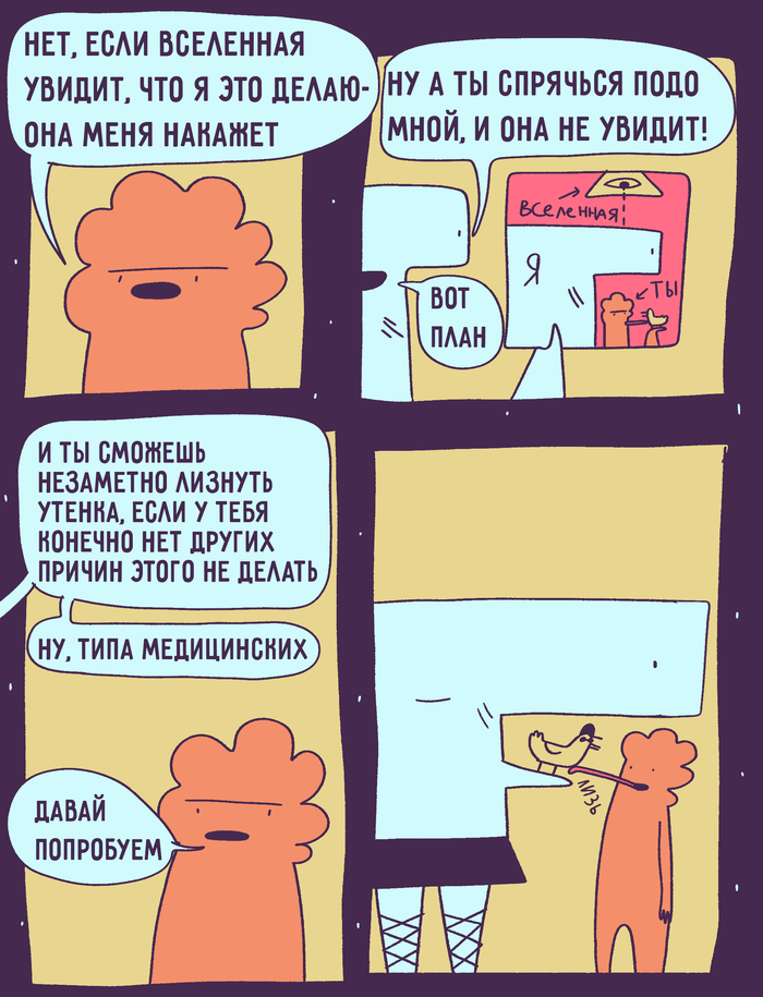 Дальше, как завещал дедушка Сталин - жить стало лучше, жить стало веселее – новая жизнь полностью захлестнула, поменяла, и, собственно, я и забыл про уточку. Вспомнил, про свою просьбу, ровно через год. И в одном из постов, с комиксом от Ильи, я в комментариях, скромно и виновато (ну реально было очень неудобно дергать – ты про меня то не забыл?), спросил, видел ли он мою просьбу еще тогда, год назад. Потому что, напомню, в отличии от многих просьб, под моей он тогда не написал, что принято, и вполне мог пропустить в той кипе комментов. Илья ответил, что видел, и помнит. Прошел год. Прошел еще год. Я иногда вспоминал, про ту просьбу, но спустя столько времени на уже не актуальна, что-то там придумать смешное, наверное, тяжко, а фигню рисовать никому не хочется. И я по-доброму забил. Вот честно пречестно, абсолютно без капелюшечки обид – срок давности истек, автор не успел, забыл, забил, ну и ничего страшного не случилось, он нас и так радовал комиксами 3 года.