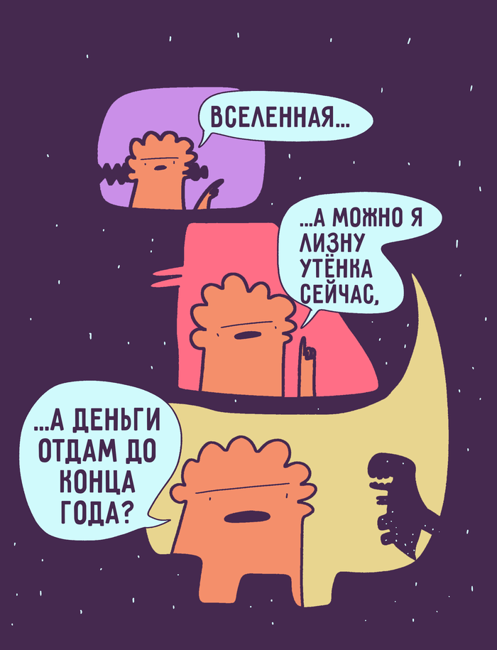 В том исходном посте, Илья, многим сразу же ответил комиксом, или хотя бы писал, что заявка принята, под моим не отписался вообще( Прождал 5 минут, 10, час, два, день, подзабил. Потом подкатил новый год, 31 декабря, первое, второе, выдохнул, поняв, что вселенная услышала мои мольбы. Прошло второе января. Прошло третье января. Начал подозревать, что пинг со вселенной медленный, коннект нестабильный, и тама несколько раз отметили мою просьбу.
