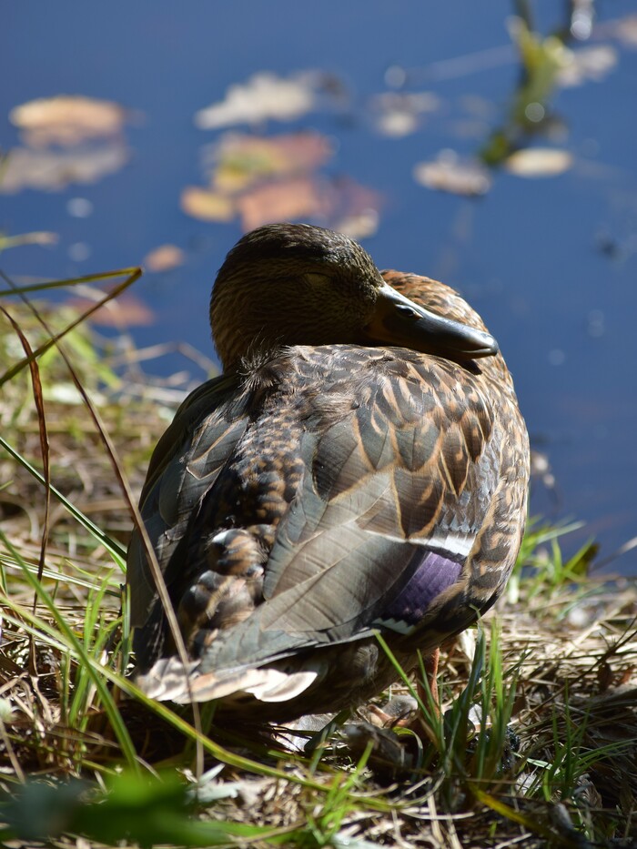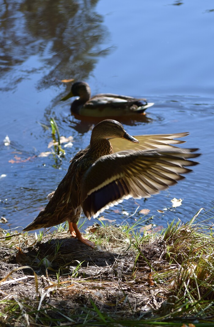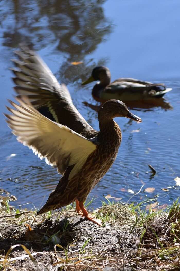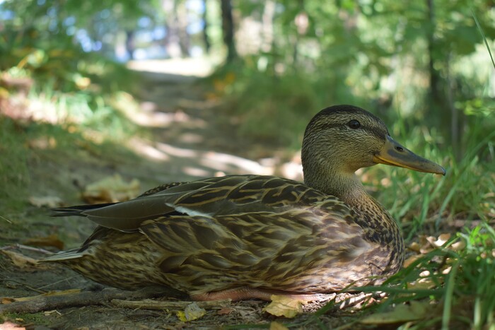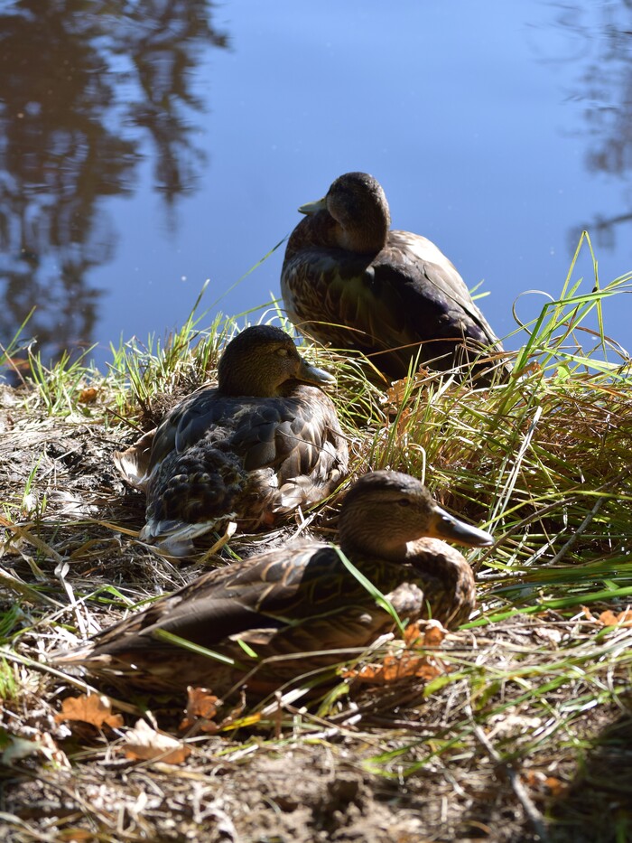 Утки! Обыкновенные утки, плавают в озере. Жирненькие, упитанные. Захотела поесть - нырк в воду, схомячила травку и сыта.