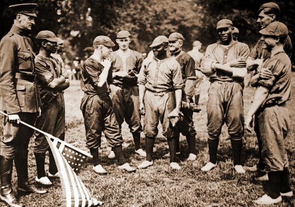 Пропагандистская идиллия: чернокожие солдаты во время игры в бейсбол со своими белыми коллегами. Лондон, Гайд-парк, июль 1918 года.