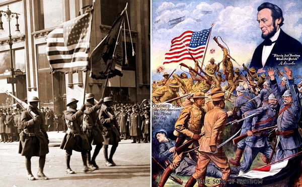Слева знаменная группа 369-го пехотного полка марширует через Гарлем в ходе парада победы в Нью-Йорке, февраль 1919 года. Справа пропагандистский плакат с чернокожими солдатами, повествующий об «истинных сынах свободы».