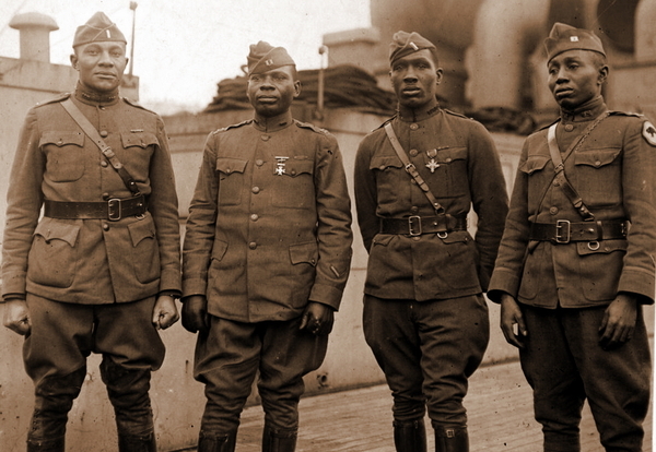 Чернокожие офицеры 366-го полка 92-й пехотной дивизии во время возвращения в Соединённые Штаты, февраль 1919 года. Слева направо лейтенант Эббот, капитан Лав, лейтенант Фишер, капитан Уайт. У последнего на плече видна нашивка с эмблемой дивизии – черным зубром в кругу цвета хаки.