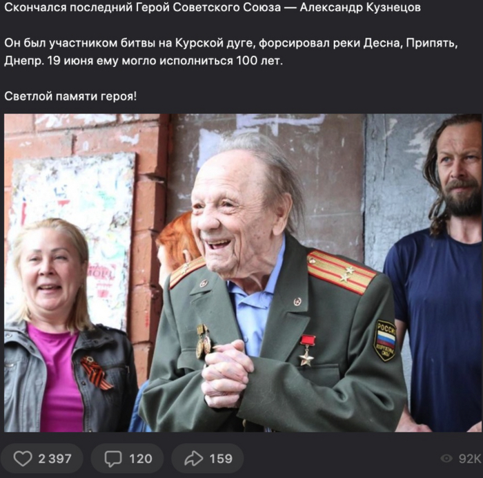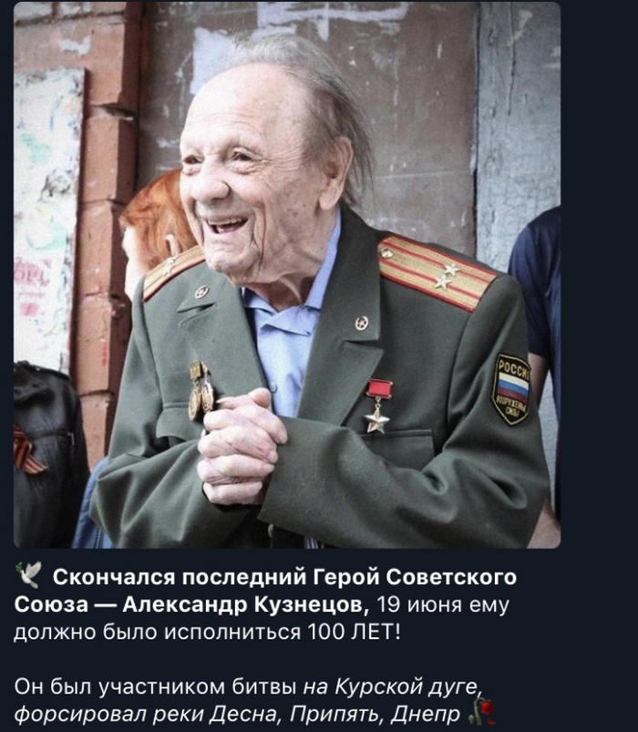 Вечная память герою, и я лично очень рад, что такие вещи трогают людей.  Но это не последний герой, есть еще живые Герои СССР. Сергей Романовцев (29 сентября 1925 ), Николай Кирток (6 декабря 1920 г.  101 год!!!!), министр Юстиции СССР Борис Кравцов (28 декабря 1922 г. 99 лет).