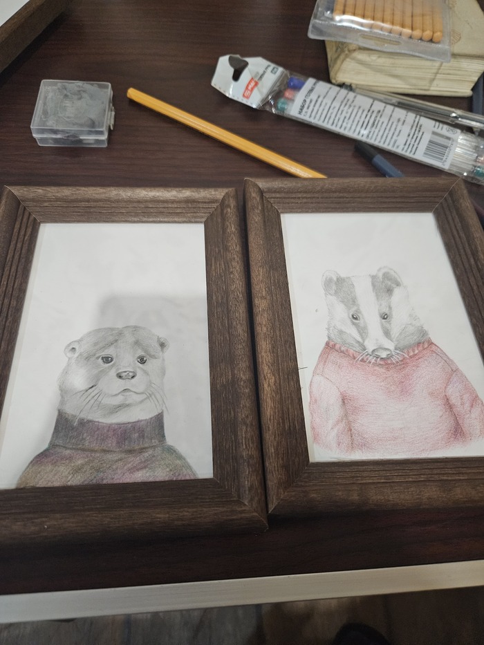 Нарисовал по повести Кеннета Грэма- "Ветер в ивах". Люблю и перечитываю книгу, но нарисовал не то, что хотел, не получилось. Хочу купить книгу с иллюстрациями, но пока не определился какую , нашел больше 50-ти разных изданий. Хотел изобразить мистера Выдру вместе с Кротом, изобразить на одном рисунке, и удочки на фоне, но запорол низ выдры и забросил, вышло то , что вышло. У Барсука хотел стойку с пистолетами над головой нарисовать , но не решился, не мой уровень. Короче , очень ограничен я в своих возможностях.