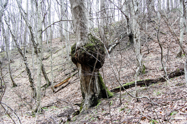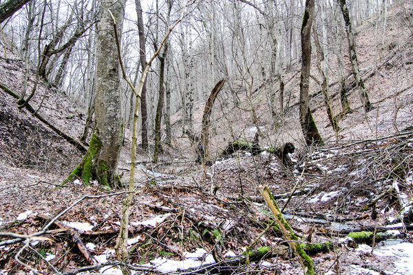 Преодолев несколько лестничных пролетов, мы поднялись на сотню метров вверх и, наконец, увидели перед собой дубовый лес. Дальше подъём был почти незаметным, но дорога оказалось непростой – скользкие участки перемежались с огромными лужами, которые приходилось обходить, чтобы не промочить ноги.