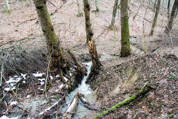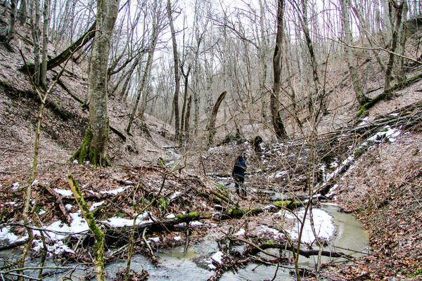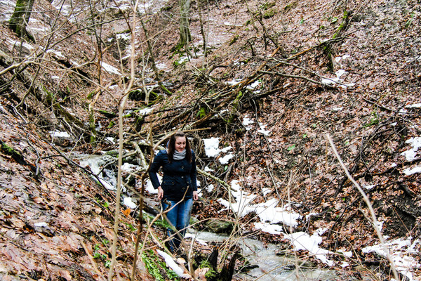 Подняться наверх, чтобы вернуться к нашему маршруту, мне не удалось. Ноги постоянно скользили по влажной почве, и я снова и снова скатывалась вниз. В конечном итоге мы решили двигаться вдоль Больничного ручья и таким образом, сделав круг, вернуться в город, выйдя к Целебному парку со стороны Дантова ущелья.