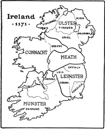 Одной из причин, по которой Генрих решил сменить военный характер экспансии в Уэльс на дипломатический, стало вторжение английских войск в Ирландию. Еще в 1158 году Адриан IV, единственный в истории папа-англичанин, издал буллу, дававшую Генриху полномочия на вторжение в Ирландию, которое должно было способствовать реформированию ирландской церкви и её подчинению папскому престолу. Однако тогда Генрих, только взошедший на престол, был занят укреплением своей власти в Англии и решил отложить богоугодное вторжение в соседскую землю на более поздний срок. Спустя 10 лет ирландская земля стала сама проситься в руки английского короля... Как и Уэльс, Ирландия была раздроблена на несколько постоянно враждующих королевств.