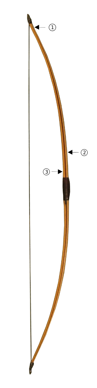 Английский длинный лук: 1. Роговая вставка (законцовка лука); 2. Спина (внешняя сторона); 3. Живот (внутренняя сторона)