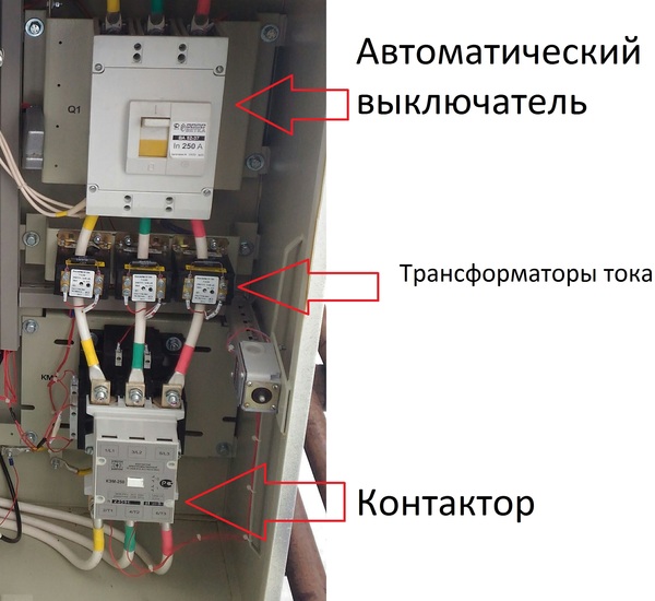 Силовые цепи включают автоматический выключатель, трансформаторы тока и контактор