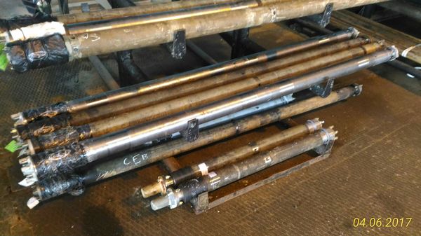 Механизированная добыча нефти в современном мире ведется газлифтом и разными видами насосов. Один из видов насоса нефтедобычи - это УЭЦН (установка электроцентробежного насоса). Если качалки (т.е. Штанго-глубинный насос) все видели, то ЭЦН незаметный для постороннего взгляда труженик. Выглядит он как обычные трубы. На рисунке, на стеллаже, справа на лево, лежат насос двухсекционный (ЭЦН), погружной электродвигатель (ПЭД), кабель питания и гидрозащита.