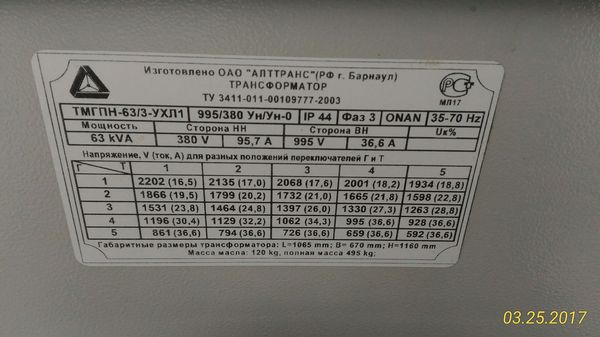 На фото дальше от нас низкая сторона (красные провода), ближе к нам высокая сторона (коричневые). Черный провод идет на плату УКИ. Внутри ТМПН он соединен с нулевой точкой обмотки. Выбираем напряжение питания ПЭД = потери в кабеле (зависит от глубины спуска насоса, у нас в среднем 1700 м) + номинальное напряжение ПЭД. Выбираем по таблице