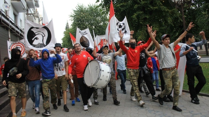 Мурат Мизов и R.W.D. маршируют по пути на матч между «Спартаком» и пермским «Амкаром» в 2015 году