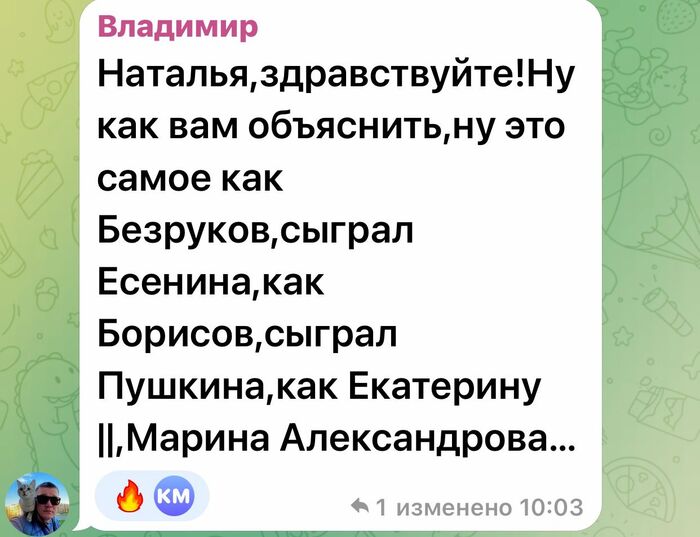 "Четвертый раз смотрю этот фильм и должна вам сказать, что сегодня актеры играли как никогда".