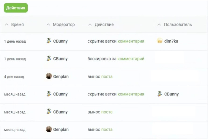 Автор @dim7ka обвиняет сообщество в вахтерстве. Вот журнал действий в сообществе, где за месяц несколько тысяч комментариев оставляет сотни пикабушников. Как видно, за месяц было скрыто 2 комментария. Один из них мой.